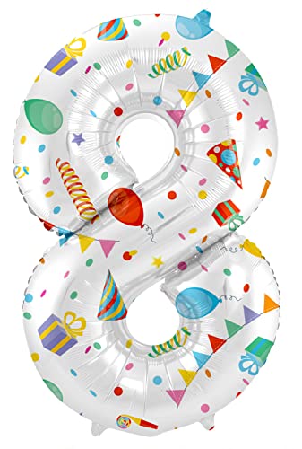 Folat 64178 ballong födelsedag siffra 8 glad fest vit med gåvor och dekoration 86 cm heliumdekoration födelsedagsdekoration, ballong nummer, färgglad