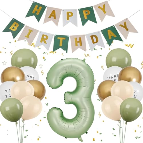 3. Födelsedagsdekoration salviagrön, dekoration 3-årsdag flickor pojkar, födelsedagsdekoration 3 år, olivgrön siffror 3, ballong Happy Birthday, folieballong 3 grön guld, ballong 3 dekoration för