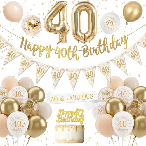 40 födelsedagsdekoration, dekoration 40. Födelsedag kvinnor, ballong 40. Födelsedag vitt guld, Happy Birthday-banderoll, jätte folieballong siffror 40 konfettiballong tårtdekorationer för 40-årsdagen