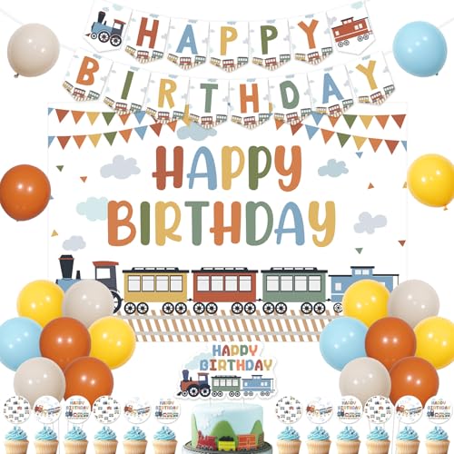 Sursurprise Födelsedagsdekorationer med tågtema, ångtåg Happy Birthday-bakgrund banderollskylt, järnväg, korsning, tårta, cupcake-topp, ballong