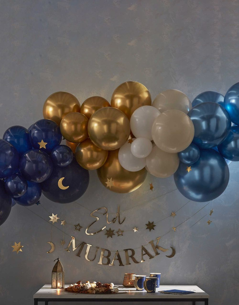 Blå, vit och guld ballongbåge set med stjärnor och måne
