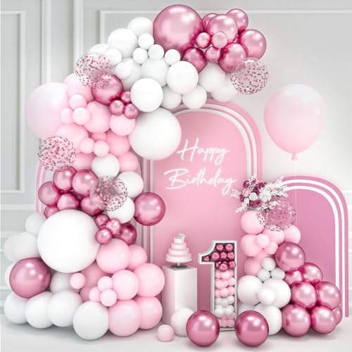 Ballongbåge i rosa och vitt – 102-delars set med rosa och vita ballonger, inklusive metalliska ballonger. Perfekt för födelsedagar, tillkännagivande av barnets kön, babyshowers och dop för flickor