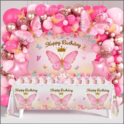 Rosa ballongbåge, balongset med rosa ballonger, fjärilsballonger, bordsduk och bakgrund, rosa ballonggirlang för 1:a födelsedagen för flickor, dop, bröllop, bröllopsdusch