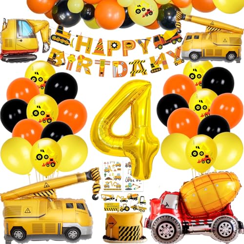 Byggplats födelsedagsdekoration 4 år, grävmaskin ballonger födelsedag 109 st, byggfordon barnkalas sats pojkar flickor med banner tårtdekoration duk, lastbil byggnadsballonger festdekoration