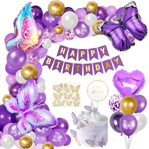 Fjärilsfödelsedagsdekorationsset, XXL-fjäril-folieballonger, för flickfödelsedag, lila festdekorationer, ballonger med fjäriltryck för barnkalas