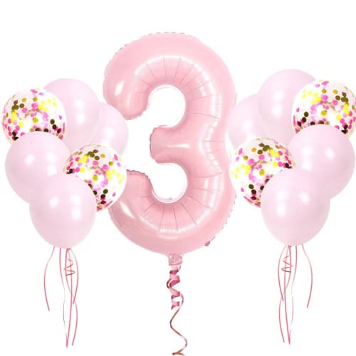 DIWULI Födelsedagsdekoration 3 år Ballongset Rosa - 3:e födelsedagsdekoration, Ballong 3 Födelsedag nummer 3 Nummer Ballong Folieballong Latexballongkonfetti Barnfödelsedagsflickor Festdekoration