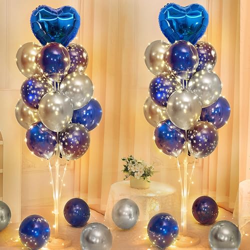 2 stycken set med ballongstativ, 1,3 m ballonghållare, LED, ballonghållare med ballonger, blått silver, återanvändbart ballongstativ för bröllop, fest, festlig dekoration