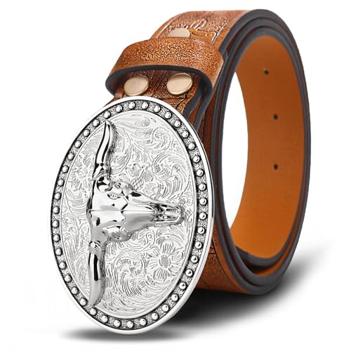 Oyifan Western Cowboy Cowgirl läderbälte, långhorn tjur blommig gravyr, kvinnor brunt stort spänne västerländsk bälte, Silver + brun, "M" Fit Waist 30-34inch