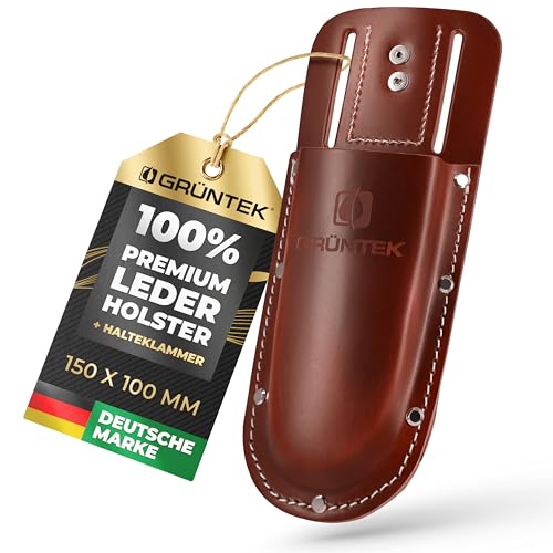 GRÜNTEK premiumhölster för trädgårdssaxar, högkvalitativt äkta läder, säkert grepp, bältesögla, stark fästklämma, verktygshållare för trädgårdssaxar, fodral, hölster, hållare (Vinröd)