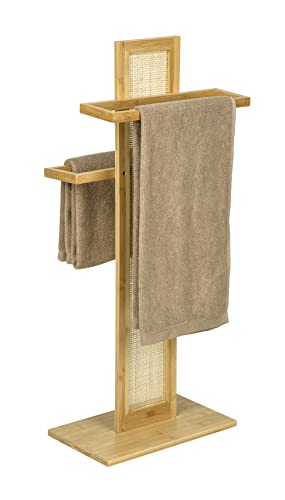 Handduksställ Allegre, dekorativ handdukshållare av högkvalitativ bambu och rottingfläta i trendig boho-stil, 2 armar för att hänga handdukar eller kläder, 37 x 88 x 22 cm