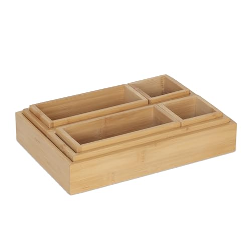 Relaxdays Förvaringslådor set om 5, lådor organisationssystem bambu, arrangör kök, badrum och kontor, olika storlekar, natur