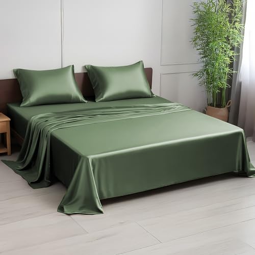 Linenwalas Bäddset i superking-storlek, 300 trådtäthet, 100 % bambu, sval satin, silke, bäddset med 1 dra-på-lakan, 1 lakan och 2 örngott (superking-storlek/avokadogrönt)