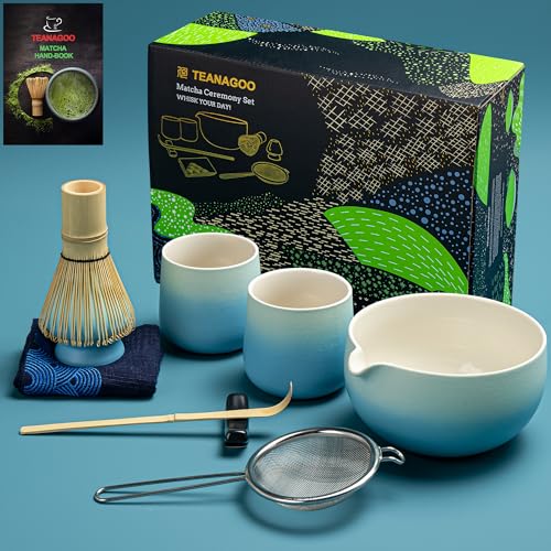 TEANAGOO Matcha Visp Set Matcha Bowl med pip Bambu Matcha Whisk Scoop Matcha Vis Holding Tea Making Kit. 1 japansk teservis, 7 st, +2 koppar (7.2 oz), S31, Gradient Blue