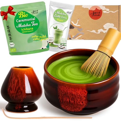 Goodwei ORGANIC Matcha från Japan i Matcha set med Matcha skål och Visphållare i matchande design, Matcha visp och Bambu sked | Teceremoni teset presentuppsättning (Burashi, 80)