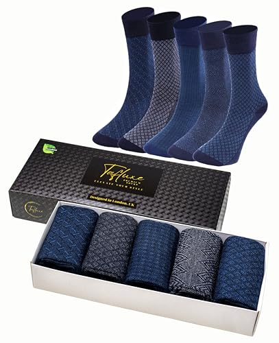 Tafluxe 5 par bambu crew-strumpor för män – hållbara luktfria antibakteriella fuktabsorberande andningsbara klänningsstrumpor med en presentask – UK storlek 7 11, Blå-grå-svart (5 par), 41-45 EU