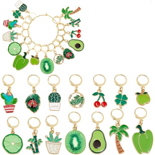 SUNNYCLUE 1 låda 14 st 14 stilar virkade stygn markörer stickning markör berlock bambu avokado körsbär klöver citron äpplen kaktus växt frukt hummerlås berlocker för vävning sömnad stickning dragkedja