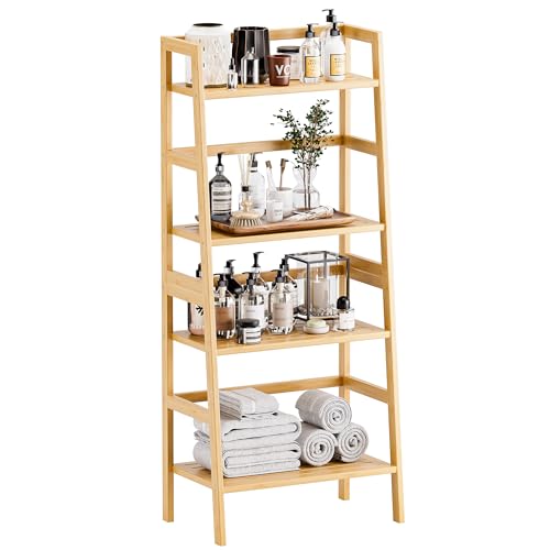 HITNET steghylla, bambu bokhylla 4-vånings badrumsförvaringsorganisation, golvstående Växt Displayställ för vardagsrum, kök, sovrum, badrum, kontor, Naturligt