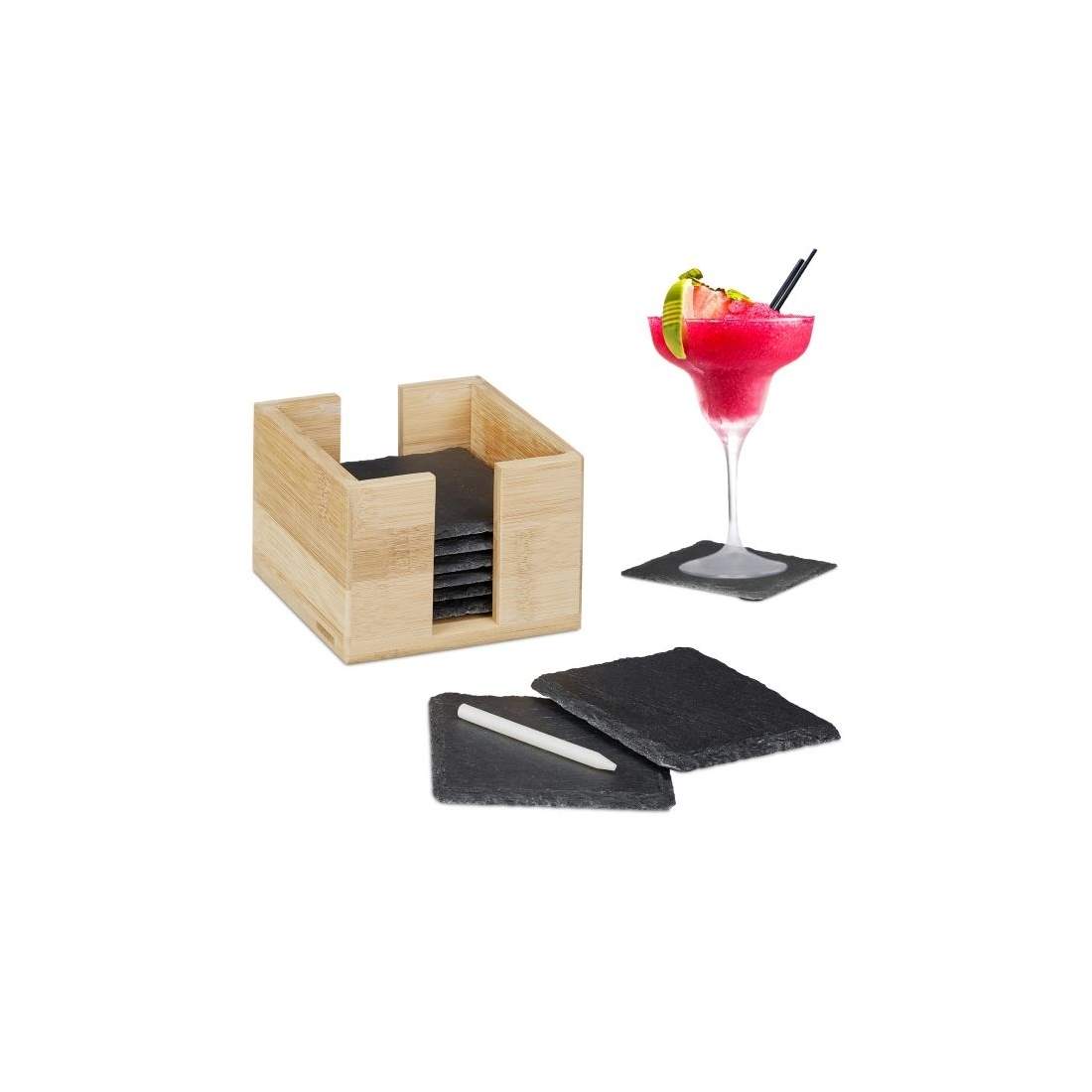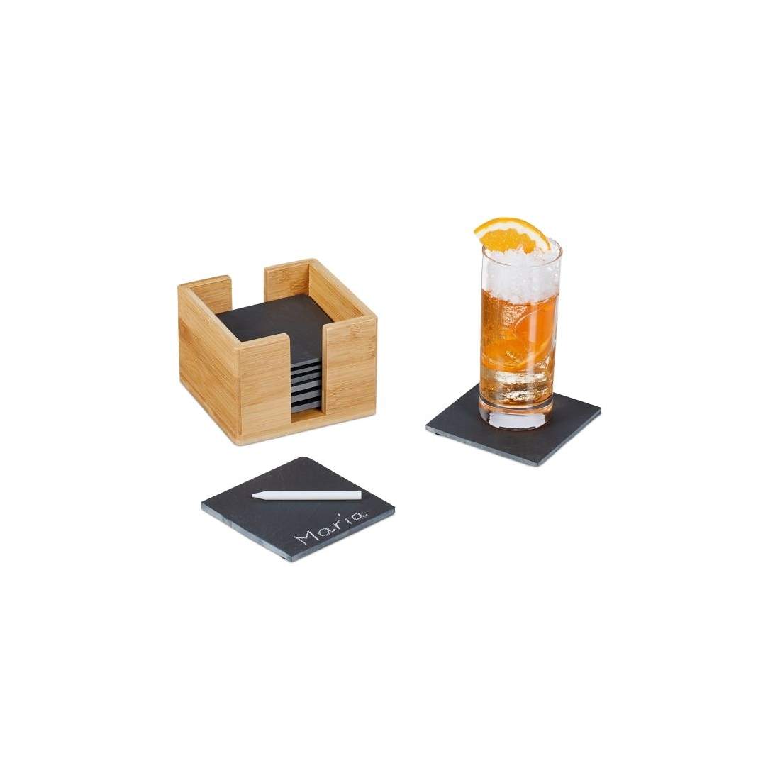 Relaxdays skifferunderlägg i set om 8, glasunderlägg med bambulåda, krita för att skriva, fyrkantig, 10 x 10 cm, natur, antracit, ljusbrun