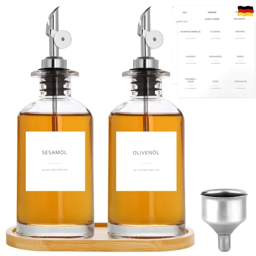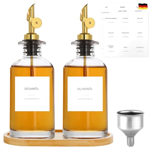Otauoaea Set Med Vinäger Och Oljeflaskor - 2 Stycken 350 ml Glasflaskor För Olivolja - Med Etiketter, Tratt Och Bambulåda - Guld