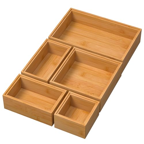Exabang 5-delad lådorganisatör, bambulåda, stapelbar, sminkbord köksarrangör, lådor, storlekar för smink, kök, badrum och kontor (natur)
