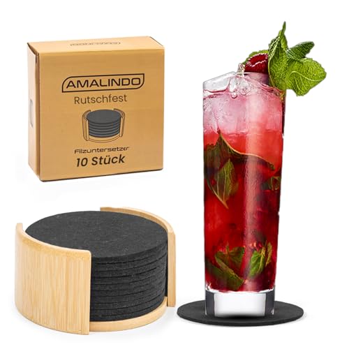 AMALINDO Filtunderlägg för glas, grå, Ø 11 cm, 10 glasunderlägg, gråa, runda – set, filtunderlägg med bambulåda, tvättbara och halkfria underlägg, glas