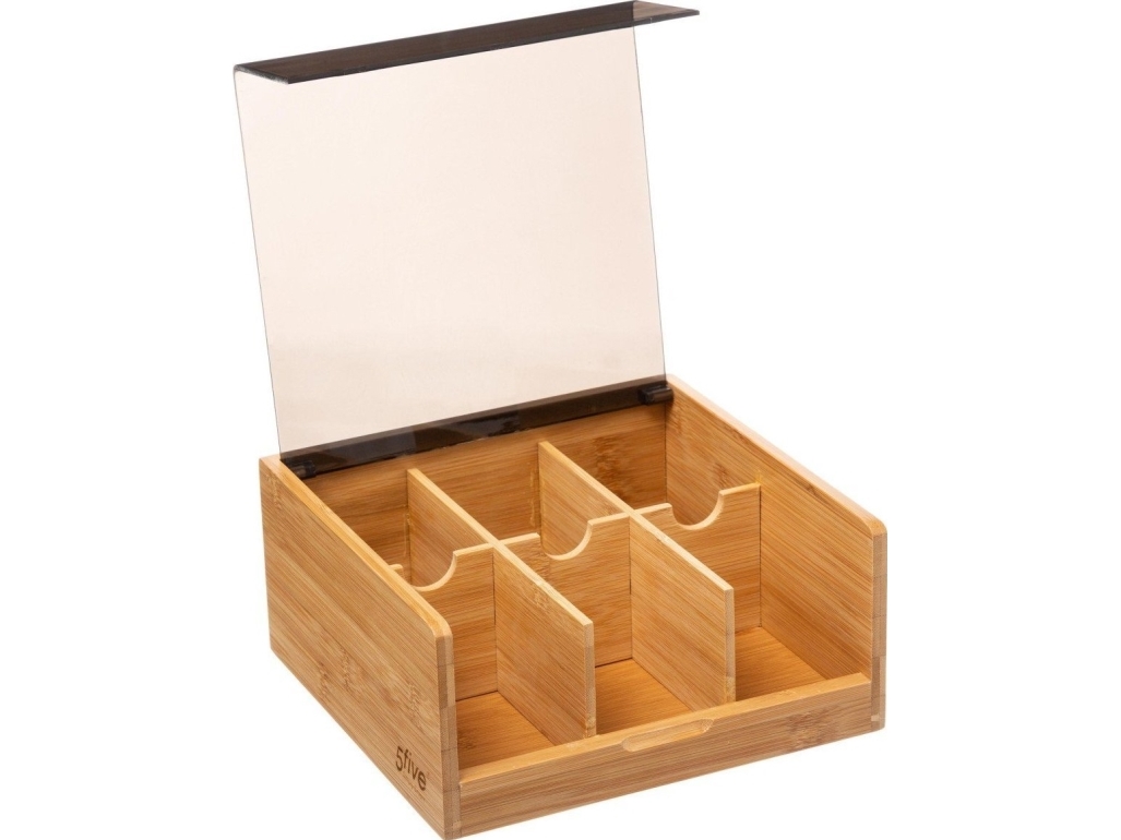 Relaxdays bambulåda med 6 fack väska caddie trä med stängbart lock + fönster kista aromsäker förvaring för färskt te, lackerat, trä, brun, 9 x 22 x 16 cm