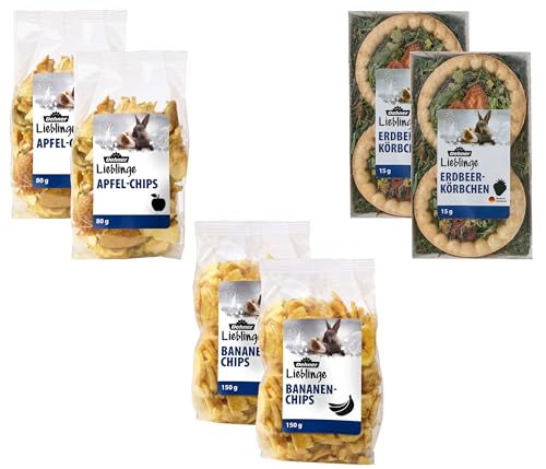 Dehner Favoritgnagarmellanmål, gnagarmat 100% naturlig, fruktblandning, 2 x äppelchips (160 g), bananchips (300 g) och jordgubbskoppar (30 g) (490 g)