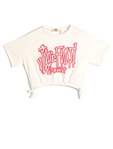 Koton Girls's Crop graffiti tryckt elastiskt band på hem kortärmad bomull t-shirt, Ecru (010), 7-8 År