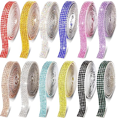 QSLKI 12 Rullar Självhäftande Kristall Strass Diamant Band 0.9cm, Glitter Harts Strass Band Diy Dekoration Klistermärke, Bling Ädelsten Konst Hantverk Klistermärke Tejp Skor Kläder