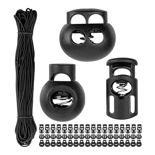 Sladdstopp och elastiskt band set, 60 klämmor, 20 meter sladd, Ø 4 mm, i svart, bandklämma jacka, sportkläder, ryggsäck, elastiskt sladdstopp, snabbsnören, sladdklämma