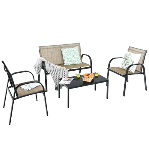 KOMFOTTEU 4-delat balkongset, trädgårdsmöbler set för 4 personer, trädgårdsset med 2 stolar & 1 bänk & 1 soffbord, utemöbler set, sittuppsättning för balkong, gård, pool