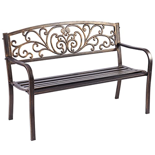 Giantex 2-sits trädgårdsjärnbänk, Bänk med vackert ryggstöd och armstöd, Vintage dubbel plats bänk för balkong, Terrass, 127 x 60 x 82 cm, brons