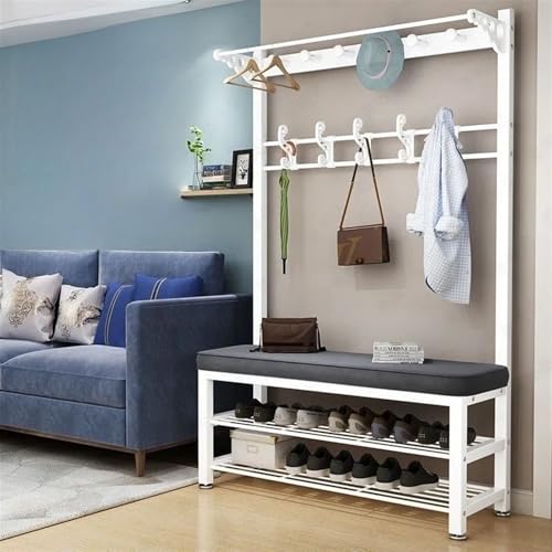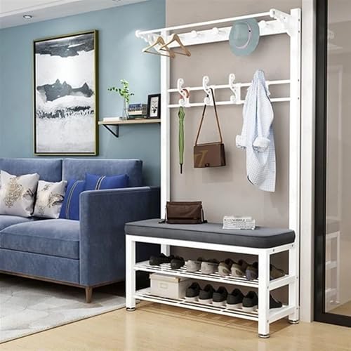 Klädhylla med skoförvaring och bänk, 4-i-1-design for kontor eller hem, med 11 krokar, 2-vånings skohyllor, metallstång, fristående hallträd i svart och vitt(vit,80)