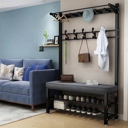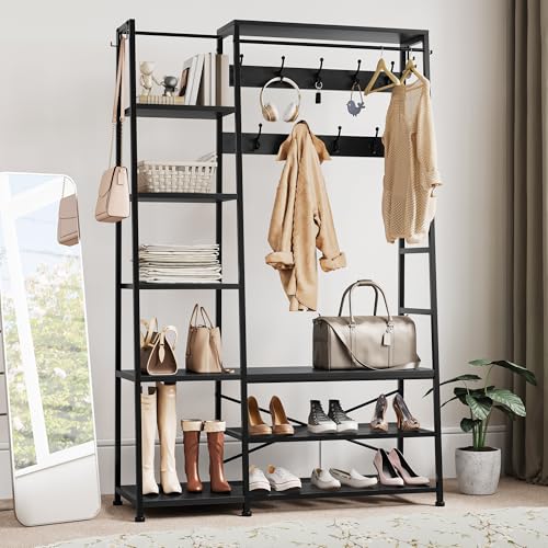 YITAHOME Klädhängare stativ med skoförvaring, fristående hallträd med bänk industriell klädhängare med 9 krokar och 5 hyllor slitstark klädstång för sovrum vardagsrum hall entré, svart