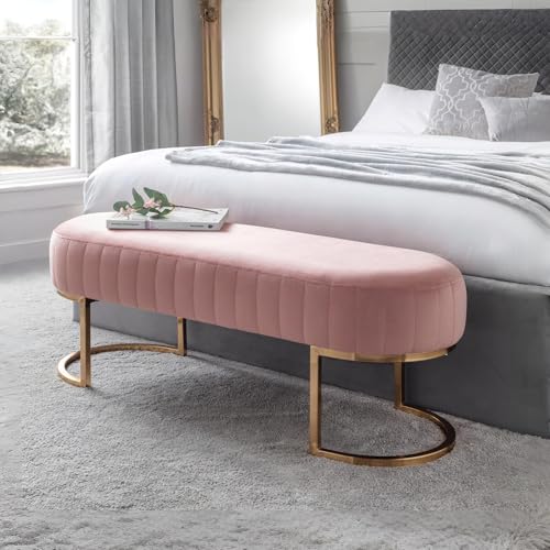 BAKAJI Sittlåda ottoman fotpall sovrum bänk pall trästruktur sammet tygöverdrag vadderad öppen sits gyllene fötter (rosa)