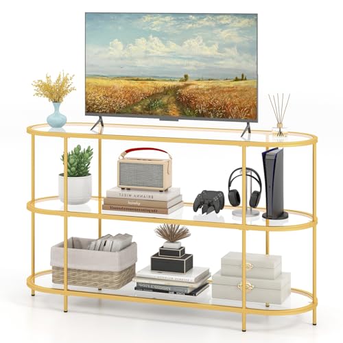 KOMFOTTEU TV-bänk vardagsrum med 3 hyllor, multifunktionell metall-TV-bänk för upp till 65 tum TV, konsolbord med hyllor i härdat glas och justerbara fötter för sovrum, senapsgul