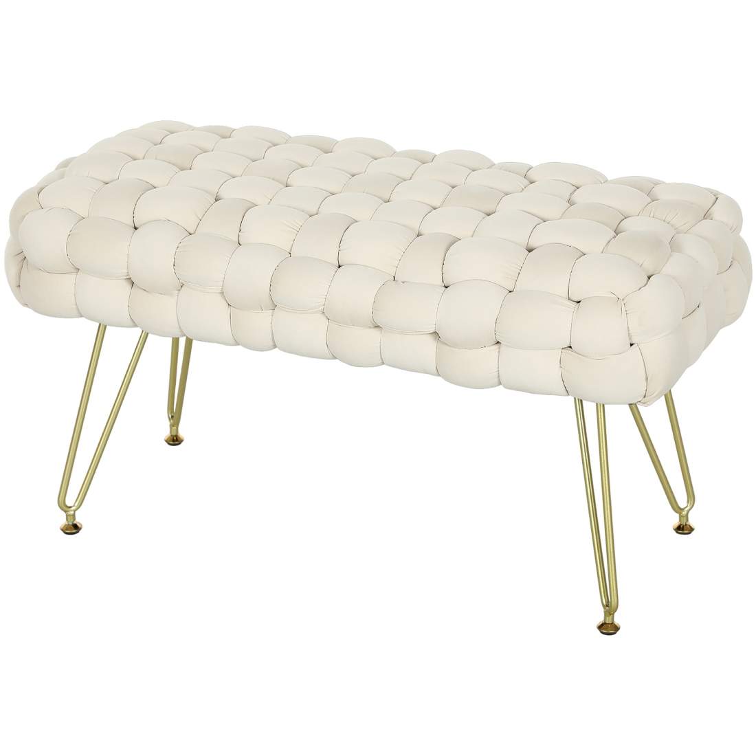 Pall, klädd bänk i sammetslook, fotpall med vadderad sits, metallben, fotstöd, för vardagsrum, sovrum, 76 x 38 x 41,5 cm, krämvi