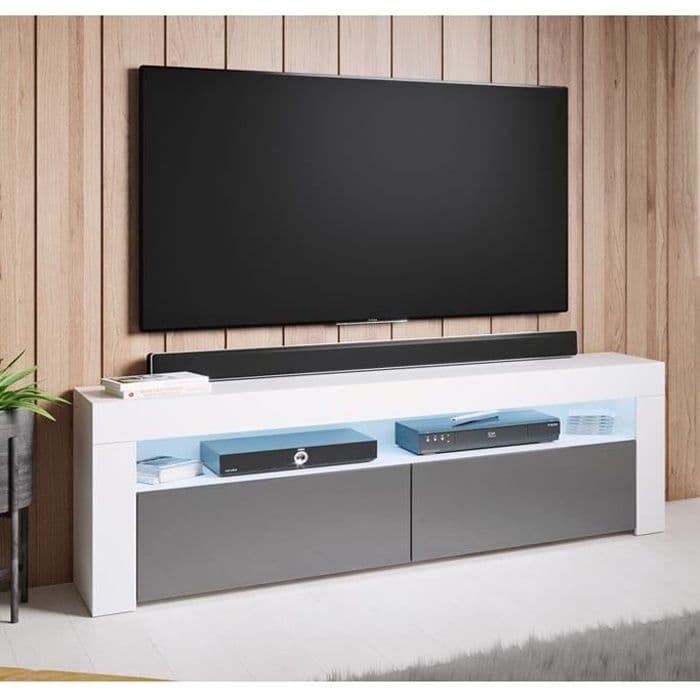 TV-bänk för vardagsrum med LED | Vit och glänsande grå | 2 Dörrar med 2 Fack | 140 x 50,5 x 35cm | Modell Aker