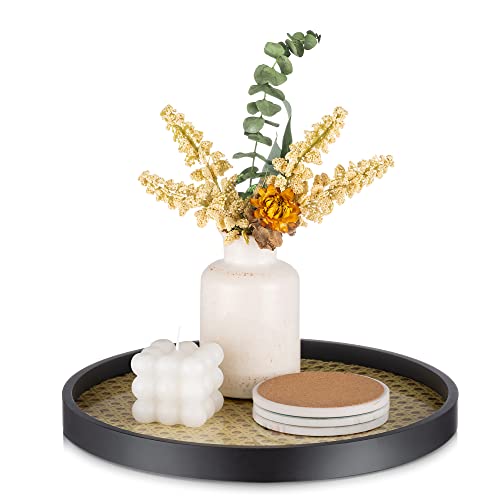 Hanobe Rund dekorativ kaffebricka: Soffbordsbrickor dekor cirkel rottingbricka med svart träram för förvaring och display serveringsbricka för bänk vardagsrum sminkbord