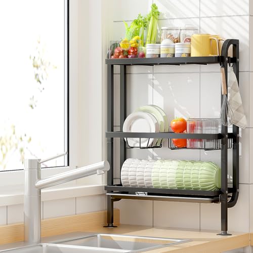 Mointal Diskställ 3-Vånings över Diskho, Stort Torkställ för Bänkskiva med Väggstöd, utan Borrning, Sugproppar & Krokar, Svart
