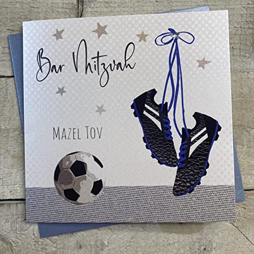white cotton cards Bar Mitzvah Mazel Tov pojkar handgjorda judiska kort, fotboll och stövlar, JE319