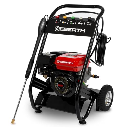 EBERTH bensin högtryckstvätt, självsugande, 210 bar arbetstryck, 5 munstycken och slang för vattensugning ingår, professionell högtryckstvätt med 6,5 hk 4-takts bensinmotor och robusta hjul