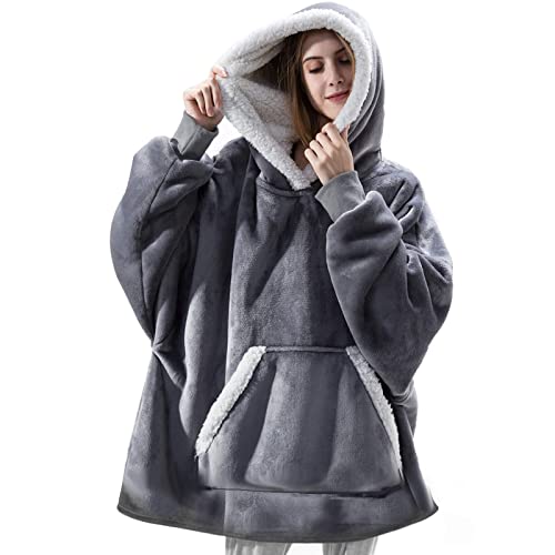överdimensionerad sherpa huvtröja, Varm Mysig huvtröja fleece filt, Med huva och extra stor framficka bärbar huvtröja tröja filt,en storlek passar alla, för damer, flickor, tonåringar (Gray)