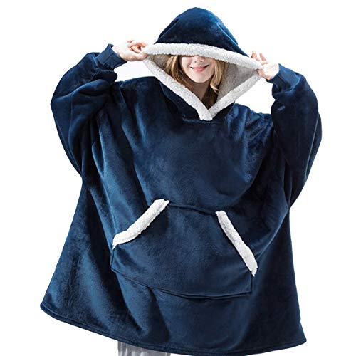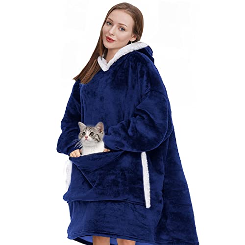 Överdimensionerad huvtröja filt tröja, sherpa bärbar filt med huva unisex en storlek passar alla – present till mamma och dotter, Marinblå/ny, One Size