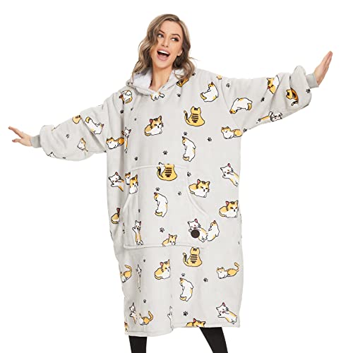 KFUBUO Bärbar filt huvtröja för vuxna sherpa alla mönster katt överdimensionerad sweatshirt filt med fickor för kvinnor