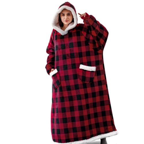 IvyH överdimensionerad huvtröja sweatshirt filt, bärbar filt sherpa huvtröja långärmad supermjuk varm huvtröja en storlek passar män kvinnor flickor pojkar unisex (röd pläd)