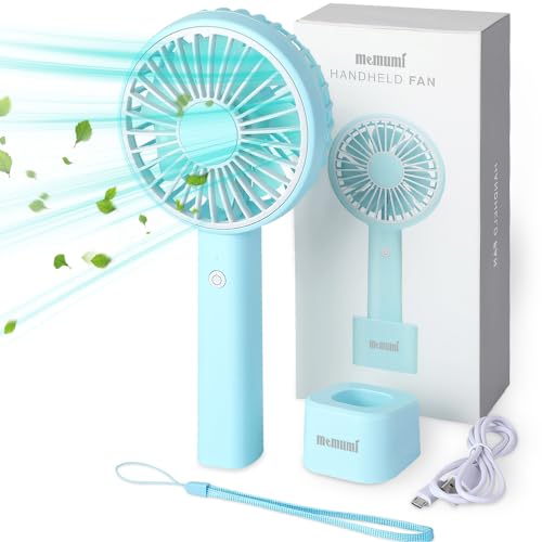 memumi Handfläkt med 3 hastigheter, fläkt USB uppladdningsbar bärbar bordsfläkt handhållen fläkt för hemmakontor resor, med avtagbar bas och fingerrem och USB-kabel – blå