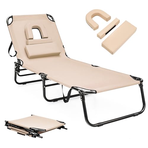 GIANTEX Vikbar solstol, med ansiktshål och avtagbar kudde, justerbart ryggstöd och fotstöd, bärbar stol för pool och strand, svart