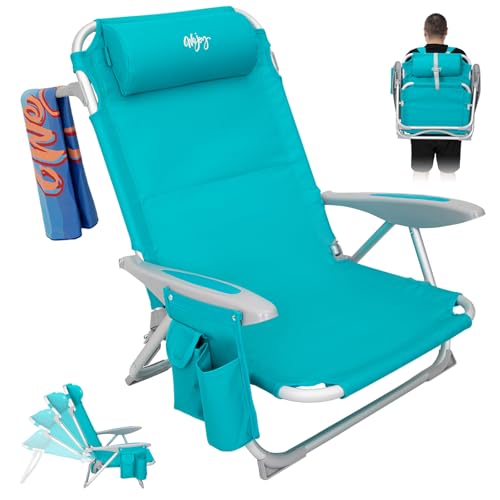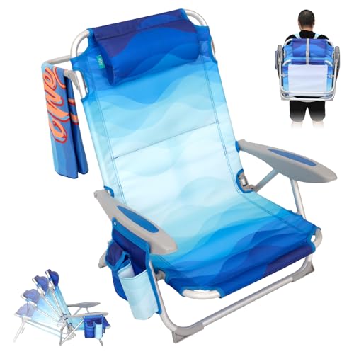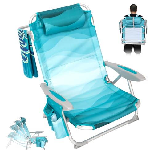 CARIBBEAN JOE hopfällbar strandstol, bärbar ryggsäck, hopfällbar campingstol med nackstöd, kopphållare och träarmstöd, blågrön
