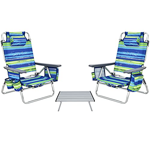 GOPLUS Strandstol, 2-pack campingstol och bordsset med ryggstöd, justerbar i 5 nivåer, nackstöd och armstöd, fällstol, vikstol, lätt bärbar med axelremmar för strand (blå + grön)